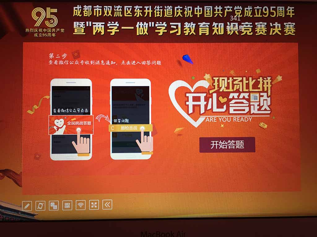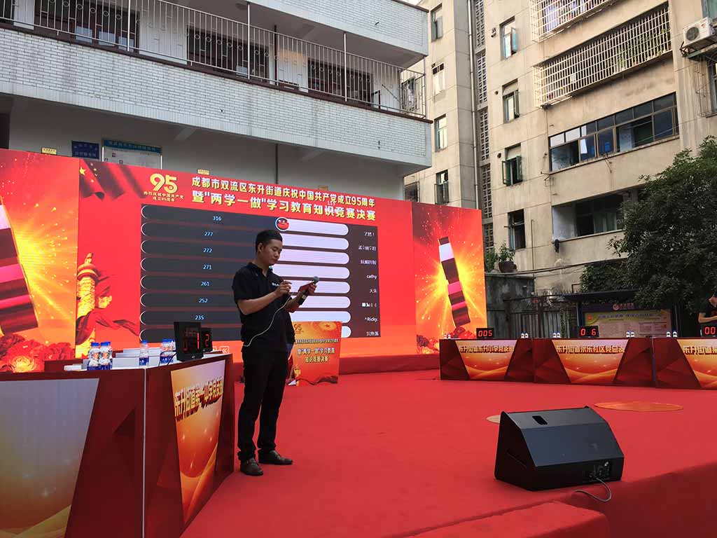 为庆祝中国共产党成立95周年,炫驰微互动受邀参加了成都双流东升街道举行的“两学一做”学习教育知识竞赛决赛的现场,此次活动,主办方选择了炫驰微互动的摇一摇功能作为比赛开始前的暖场小游戏,既充分调动了观众的热情,又缓解了选手的赛前紧张情绪,与此同时,现场观众纷纷拿起手机参与大屏互动,表达自己对各参赛队伍的支持。值得一提的是,炫驰微互动为本次决赛活动定制了专属开心答题系统,在每个竞赛的环节间隙使用开心答题,让台下观众也能切身参与到整个活动中,传播知识,传递快乐,这就是炫驰微互动的互动魅力!