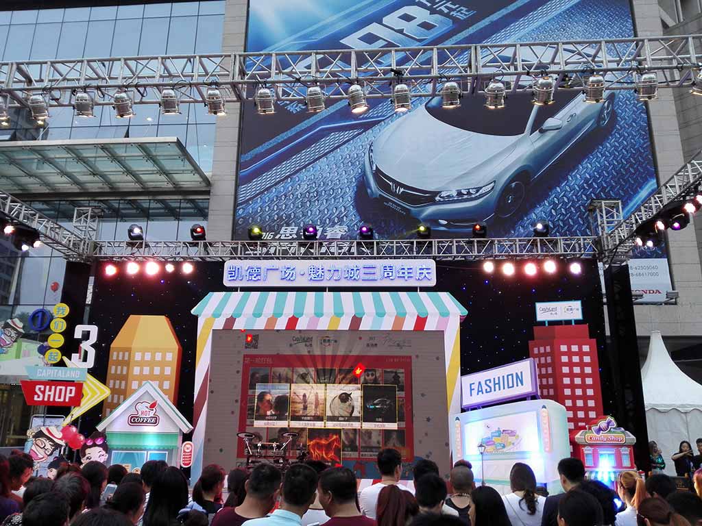 5月28日,凯德广场魅力城店迎来了盛大的开业3周年庆典。此次活动,炫驰微互动作为现场互动唯一的支持者,完美的为内场福利派发和外场欢乐互动提供了解决方案。外场活动大约在晚上7点正式开始,来宾使用手机关注凯德官方微信号,即可实现头像和昵称的“上墙”,这些头像组成了本次活动的主题“我们在一起3”,围观群众在欣赏台上热闹的表演的同时,还可与台上大屏幕实现无缝交流,真的是好看又好玩~在看看内场的盛况,活动规定满200即可参与炫驰微互动抽奖,大奖包含iphone6S,iwatch,ipad mini等接近4000个礼品全部送送送!所以炫驰微互动前必须是排上了长长的队伍,直到晚上11点30大转盘才为热情的消费者抽取完全部的福利。人流量极大的商场互动,炫驰微互动也能轻松把控哦~
