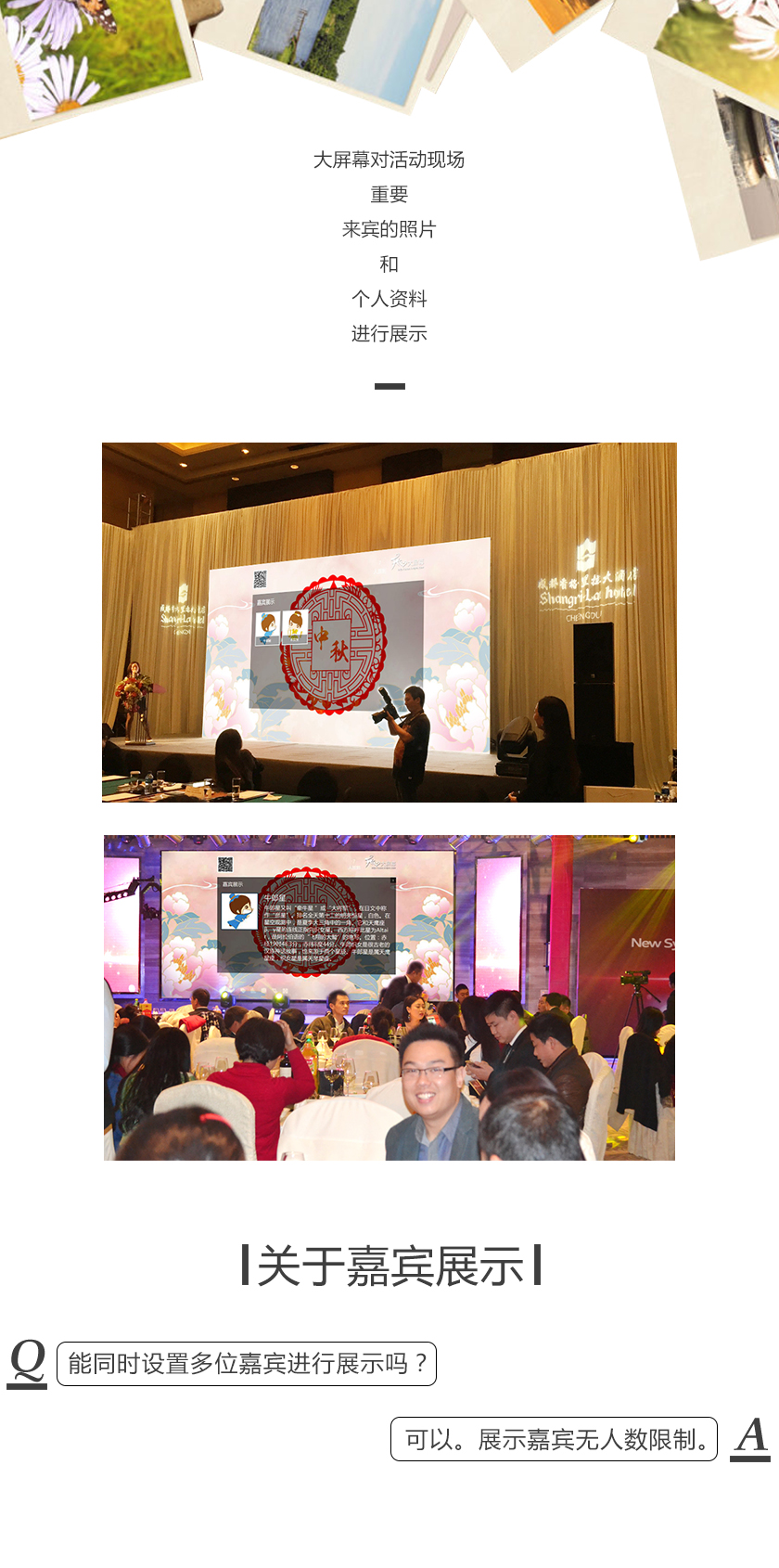 大屏幕展示活动现场重要来宾的照片和详细信息。
