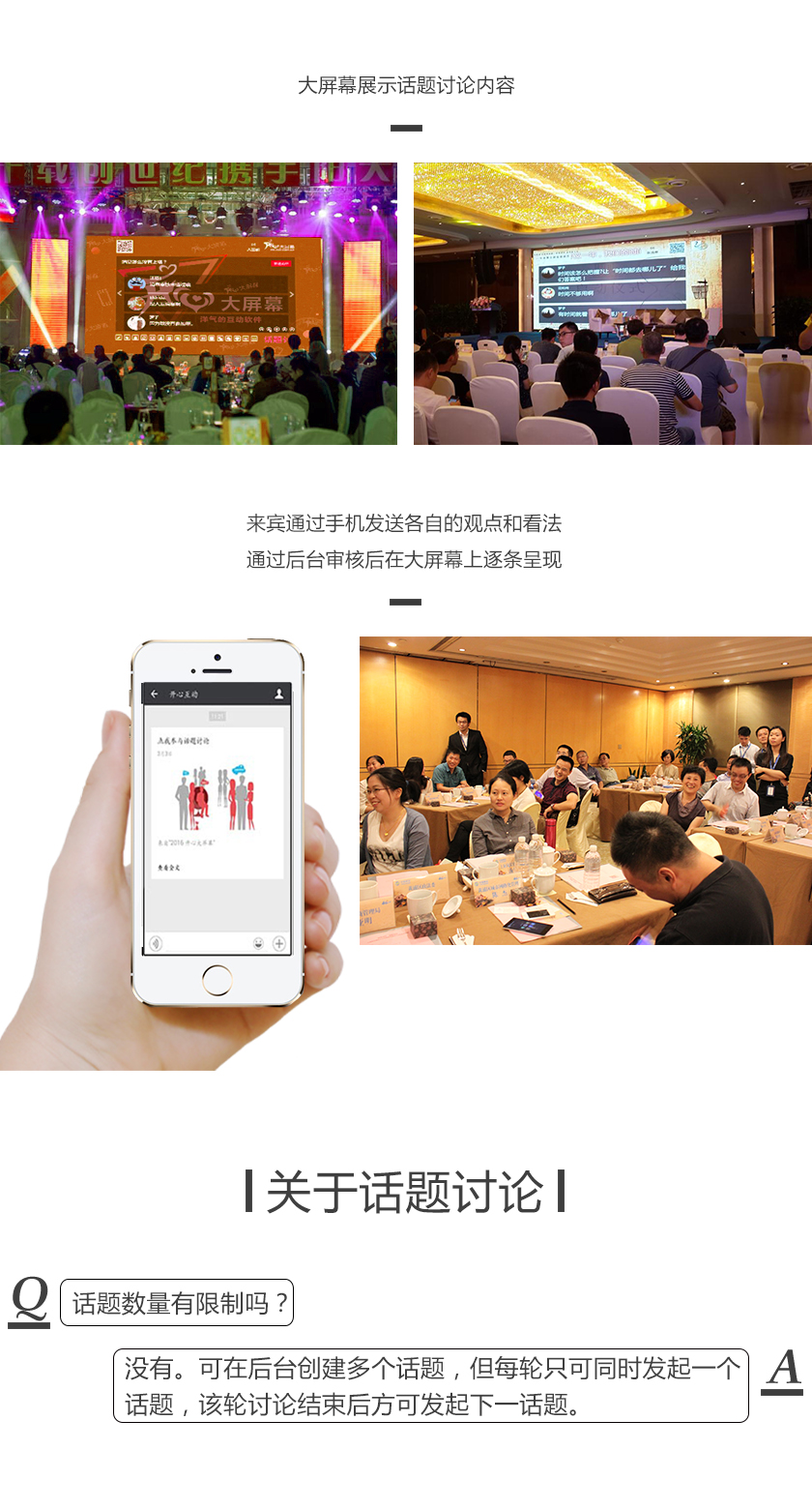 来宾通过手机点击话题讨论参与链接,大屏幕展示话题内容并汇集全场来宾发送的观点。