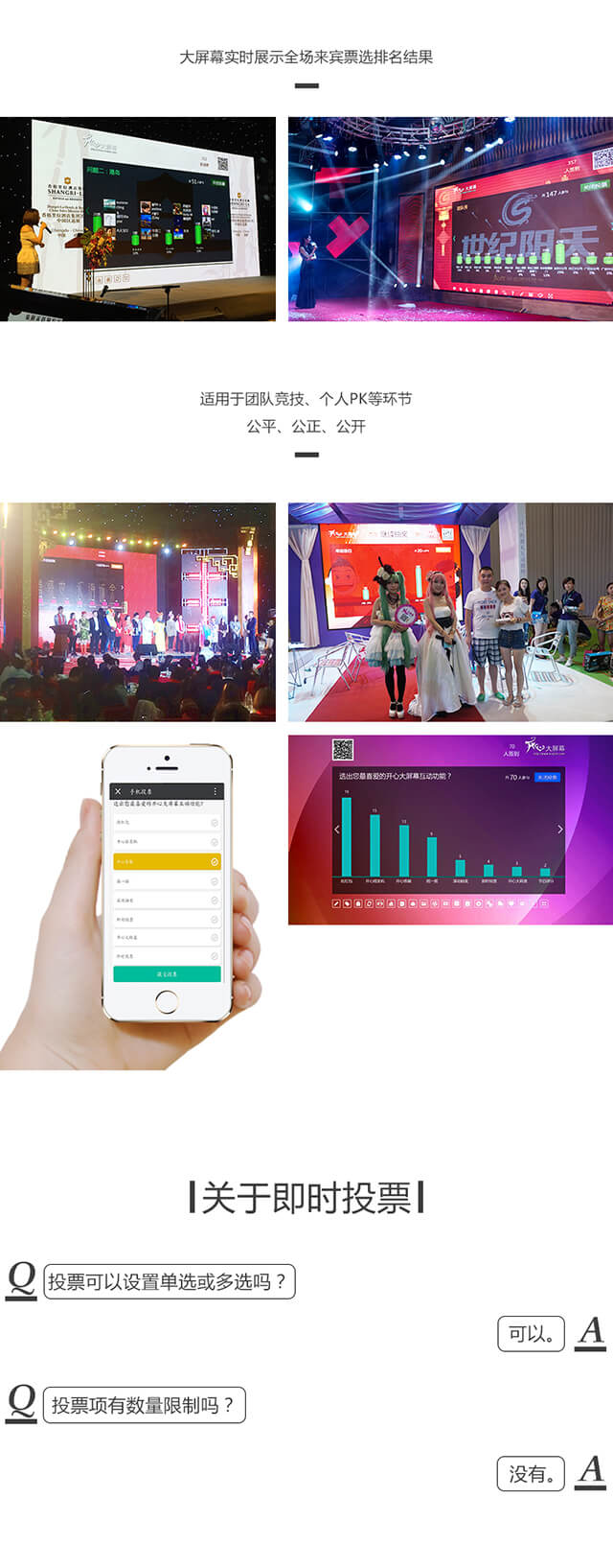 来宾点击手机推送链接参与投票,大屏幕实时展示票选排名靠前项,可选择文字投票或图片投票。