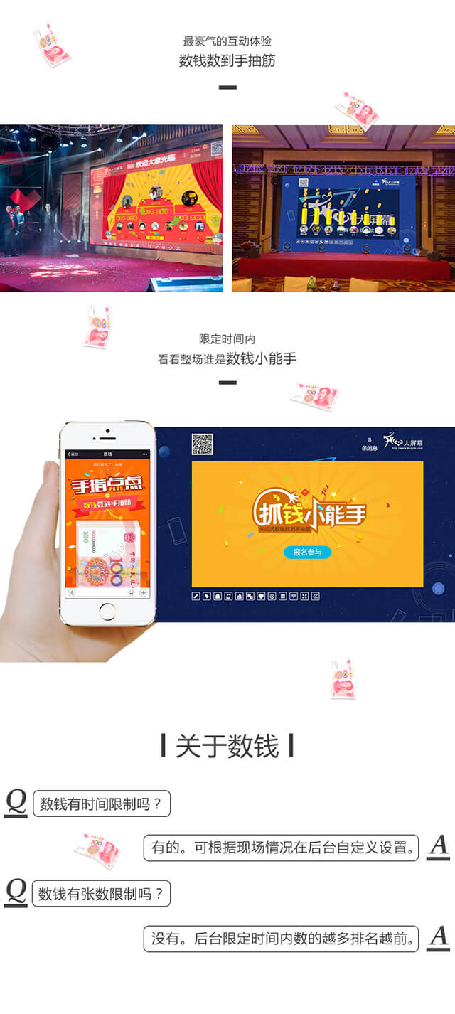 来宾通过手机点击数钱参与链接,大屏幕实时展示限定时间内排名在前的参与者。