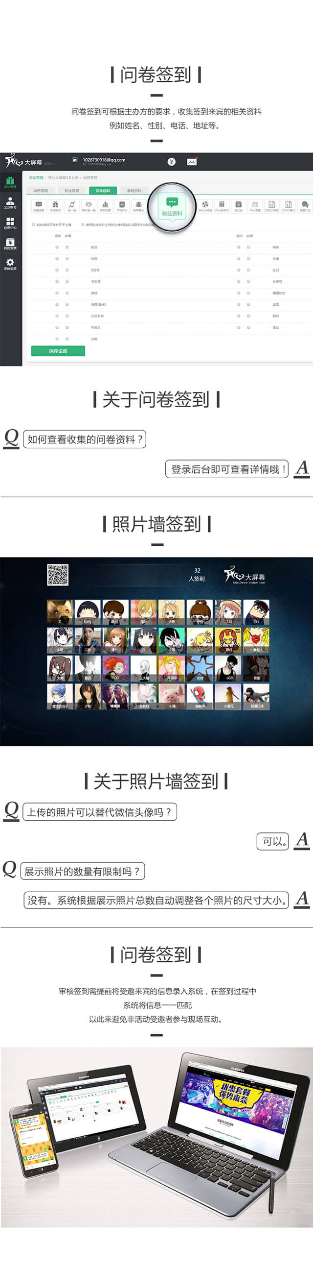 定制活动专属签到流程,包含问卷签到、照片墙签到、审核签到等。