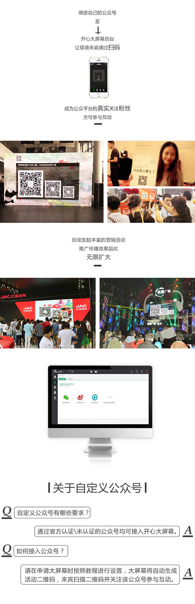接入用户公众号,来宾扫码签到参与大屏互动,同时成为公众平台真实有效的“粉丝”。